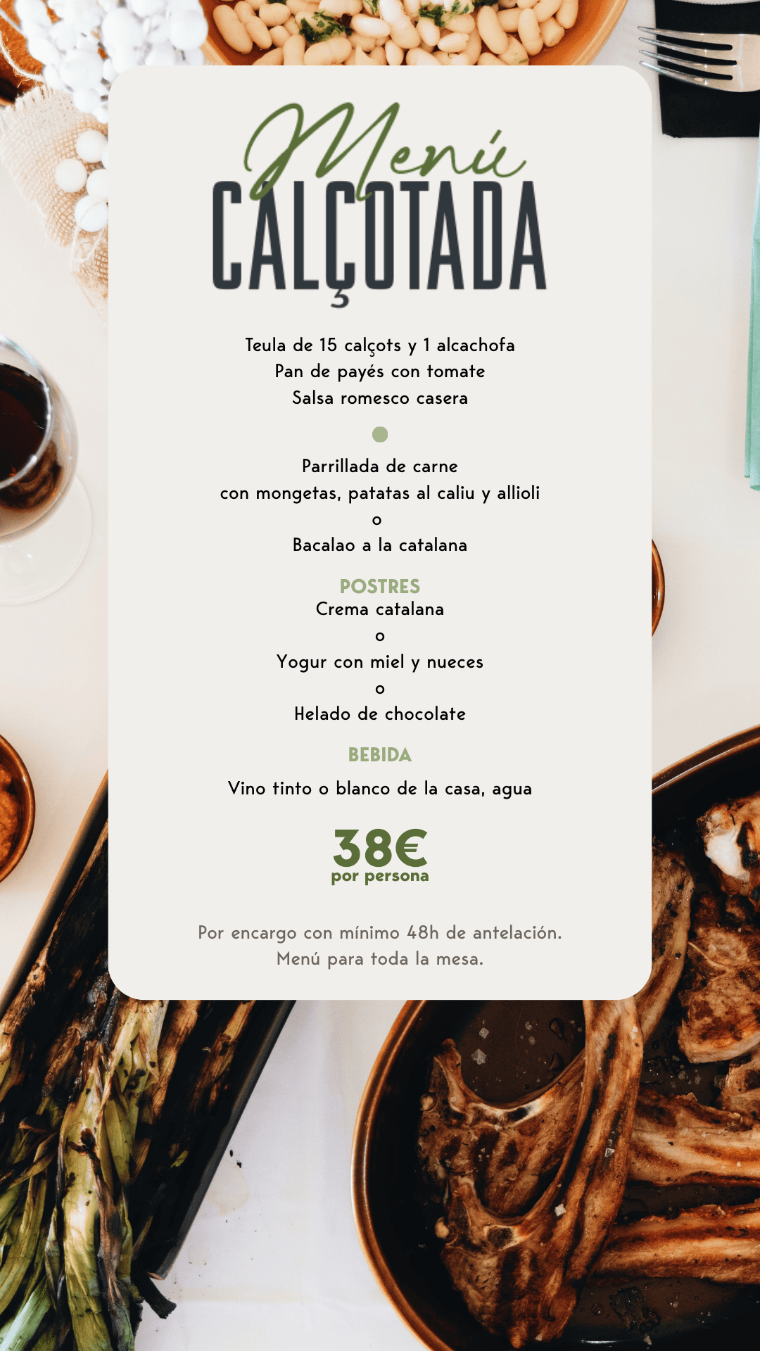 Déjate seducir por la tradición catalana en un entorno natural único, a solo minutos de Barcelona. Esta temporada, disfruta de nuestra exclusiva calçotada en Barcelona: menú completo con calçots, parrillada de carne o bacalao a la catalana, postres caseros y vino, todo preparado al momento.